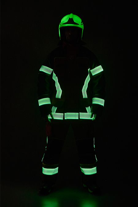 従来の夜間反射ストリップに加えて、SUPER ARMOR GUARDIANには、完全な室内の暗闇の中でも目に見える光を放つ自己発光フォトルミネセントテープが装備されています。SUPER ARMOR GUARDIANを使用することで、消防士は任務中の非常に困難な状況をより適切に管理できるようになります。